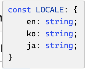 en, ko, ja 모두 string 타입으로 추론된다. 하지만 내가 의도한 바는 각 언어 키 값은 단순 string 타입이 아닌 더 좁은 언어 코드 형태의 리터럴 타입으로 하는 것이다.