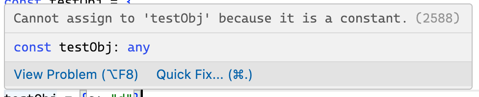 아래와 같이 testValue는 constant한 값이기 때문에 재할당이 불가능하다고 뜰 것이다.