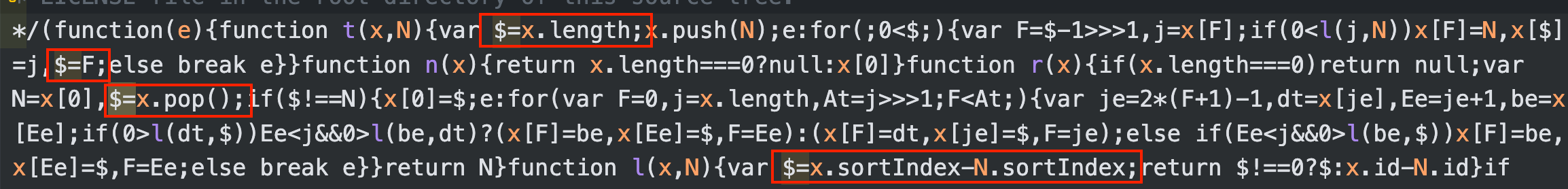 다시 빌드된 파일을 확인해보면 $에 할당하는 구문은 보이지 않는다.