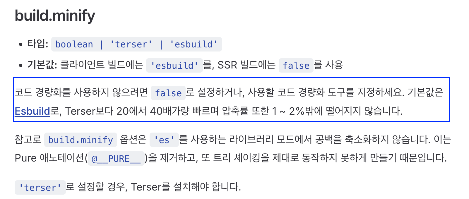 이렇게 적용하고 보니 minify시에 esbuild를 사용할 때보다 확실히 빌드 시간이 느린 것을 확인할 수 있었고 공식 문서에서도 다음과 같은 내용이 있다.