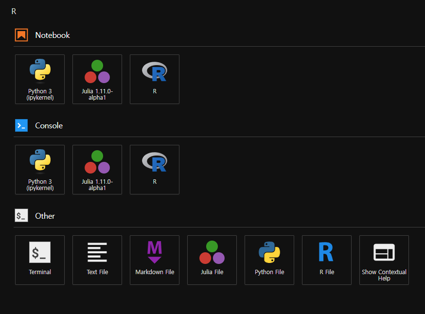 r-irkernel을 설치하여 Jupyter lab에 R 커널을 활성화할 수 있다. 패키지 설치를 위한 채널은 가장 간편한 conda-forge를 사용한다.