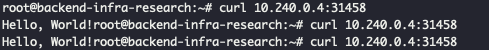 위와 같이 명령어를 통해 ip와 포트를 알아냈다면 curl 명령어로 접근해보면 hello world가 잘 뜨는 것을 볼 수 있다~