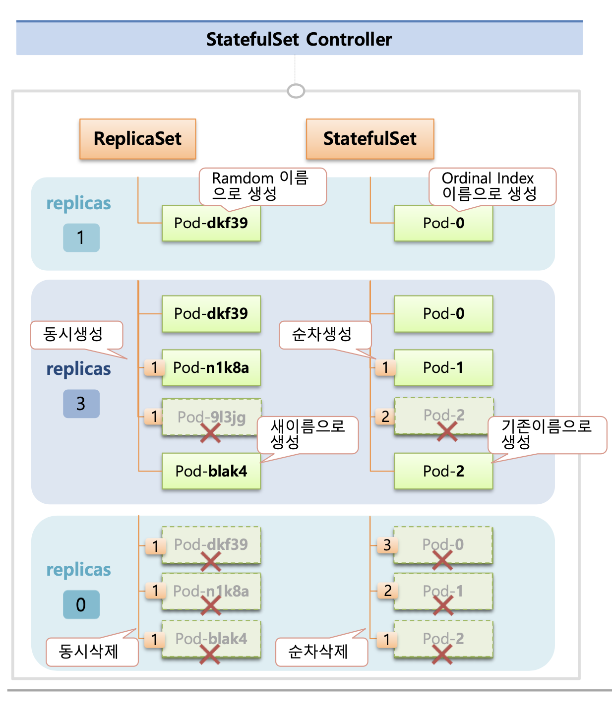 | replicas 0 설정 시 | 동시 삭제 | index가 높은 순으로 순차적 삭제 |