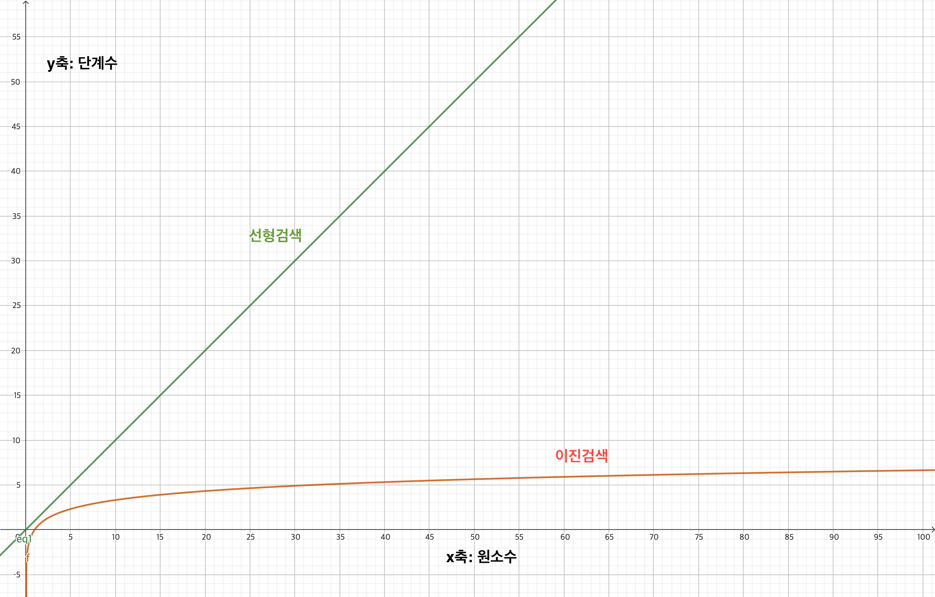 정렬된 배열의 크기가 두배 늘어날 때마다 이진검색의 단계수는 1씩 증가한다.