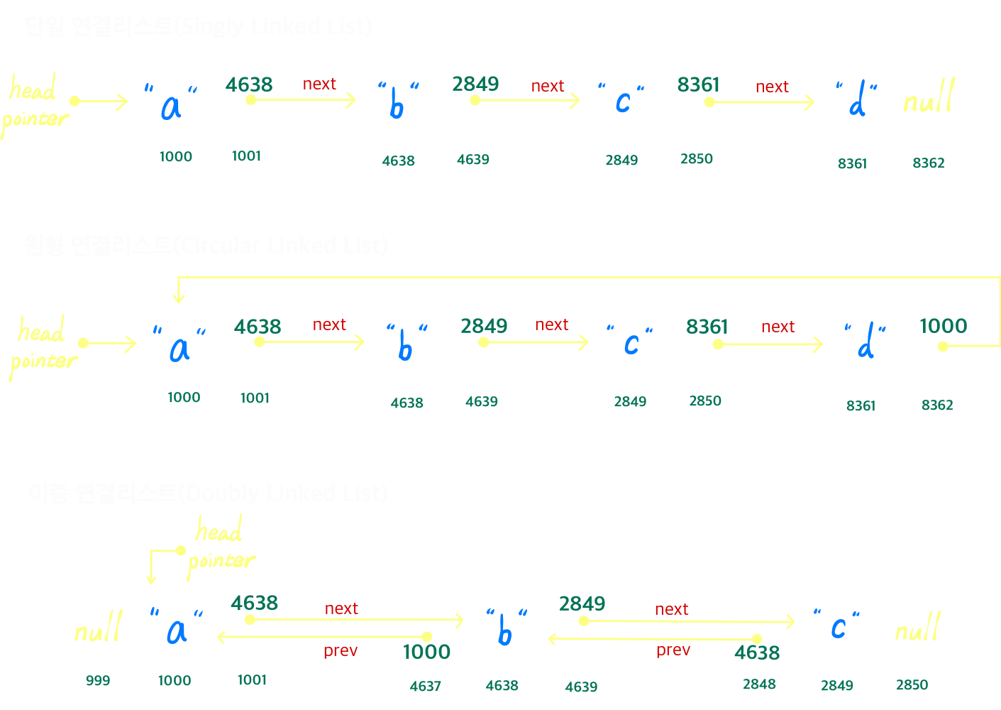 - 이중원형 연결리스트를 구현하고 싶다면 헤드의 prev field에 테일의 주소값, 테일의 next field에 헤드의 주소값을 저장하면 된다.