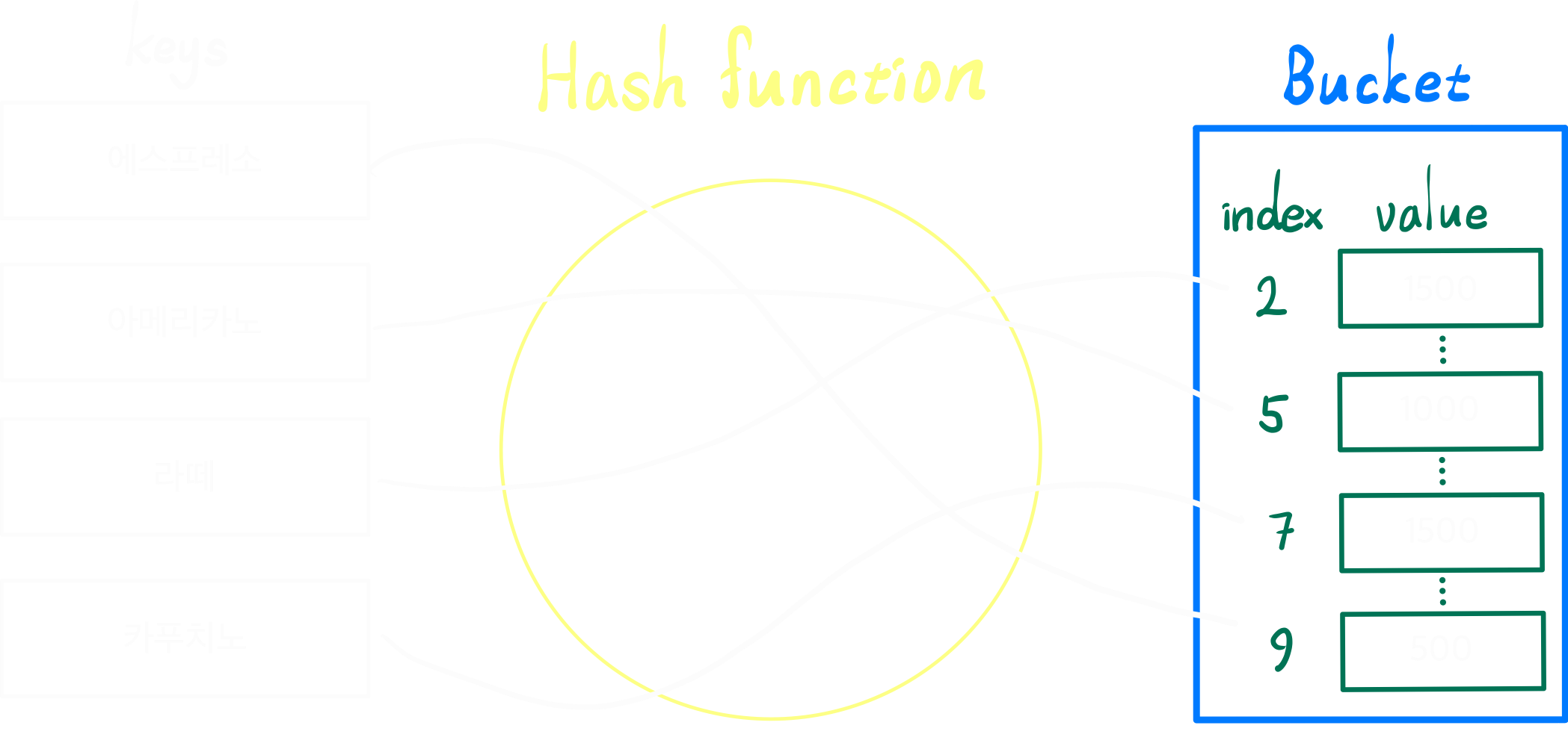- 이제 다음과 같이 해시테이블을 생성한 후 라떼의 가격을 한다면 다음과 같이 O(1)의 단계가 걸린다.