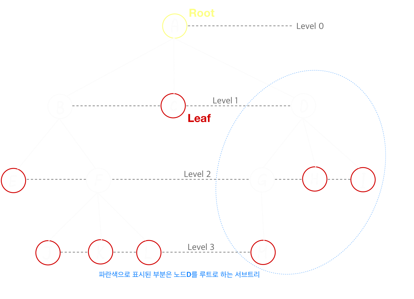 - 형제(sibling): 부모가 같은 노드 (G, H, I는 형제노드)