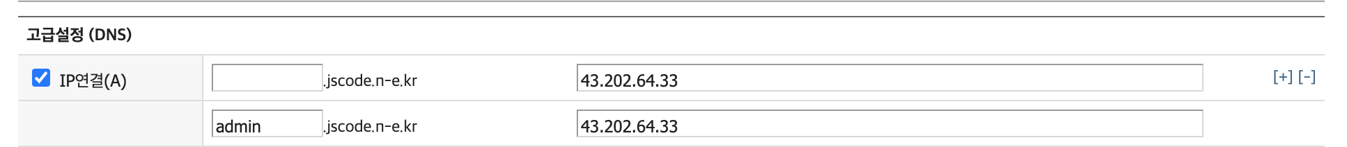 도메인하나를 선택해 등록하고 [수정]을 통해 연결할 IP주소를 등록한다. 발급받은 기본 도메인 주소를 통해 React 프로젝트를, 앞에 admin을 붙인 도메인 주소로 접속하게 되면 Next 프로젝트를 보여주도록 설정할 것이다.