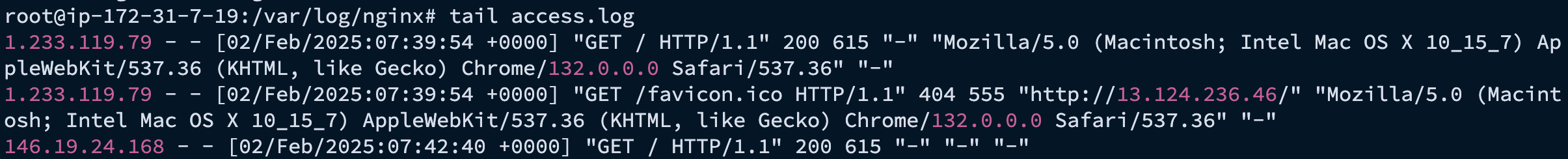 tail 명령어에 -f 옵션을 붙여주면 발생하는 로그를 콘솔창처럼 실시간을 확인이 가능하다. 해당 명령어를 사용하고 nginx가 설치된 ip 주소로 접속을 여러번 시도해보면 로그가 쌓이는 것을 확인할 수 있다.