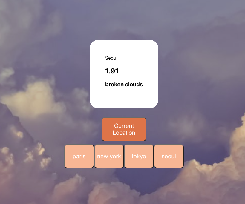 각각 버튼을 눌렀을때 해당 도시의 날씨정보 가져오는 버튼을 추가해보려고 해봤다. 일단 UI 는 이렇게 짰고 현재 App.js 가 있고 기존 WeatherBox.jsx (=info)와 추가로 WeatherButton.jsx 만들었다. 이제 어떻게 해야할지 막혔다..