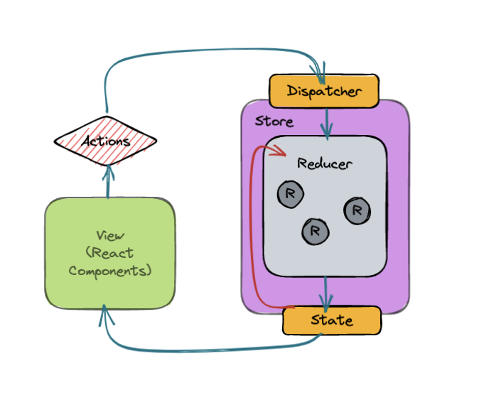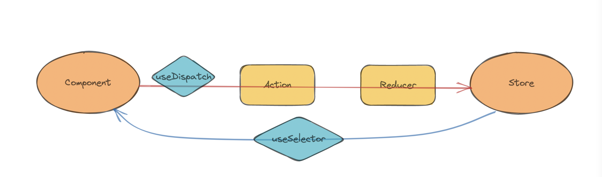 → 컴포넌트에서 action이라는 객체를 통해 변경된 state 를 dispatch. → redux store 내의 action 함수에서 state 를 reducer로 보낸다. → reducer에서 state를 가공하여 return 한 후에 component 가 update.