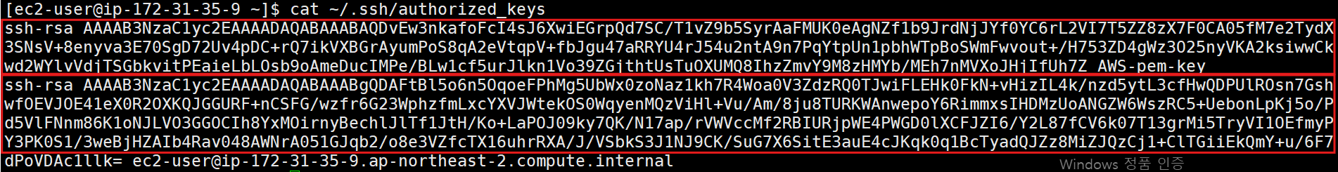 아까 생성한 .pem 파일의 내용을 기존의 authorized_keys에 추가함.