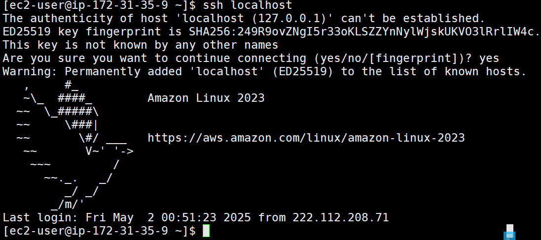아래 명령어 입력하면 .pem 파일로 나 자신에게 접속해 볼 수 있음.