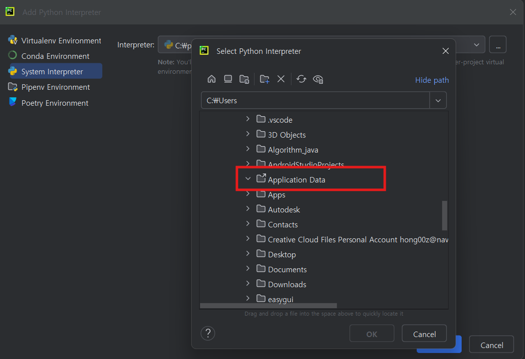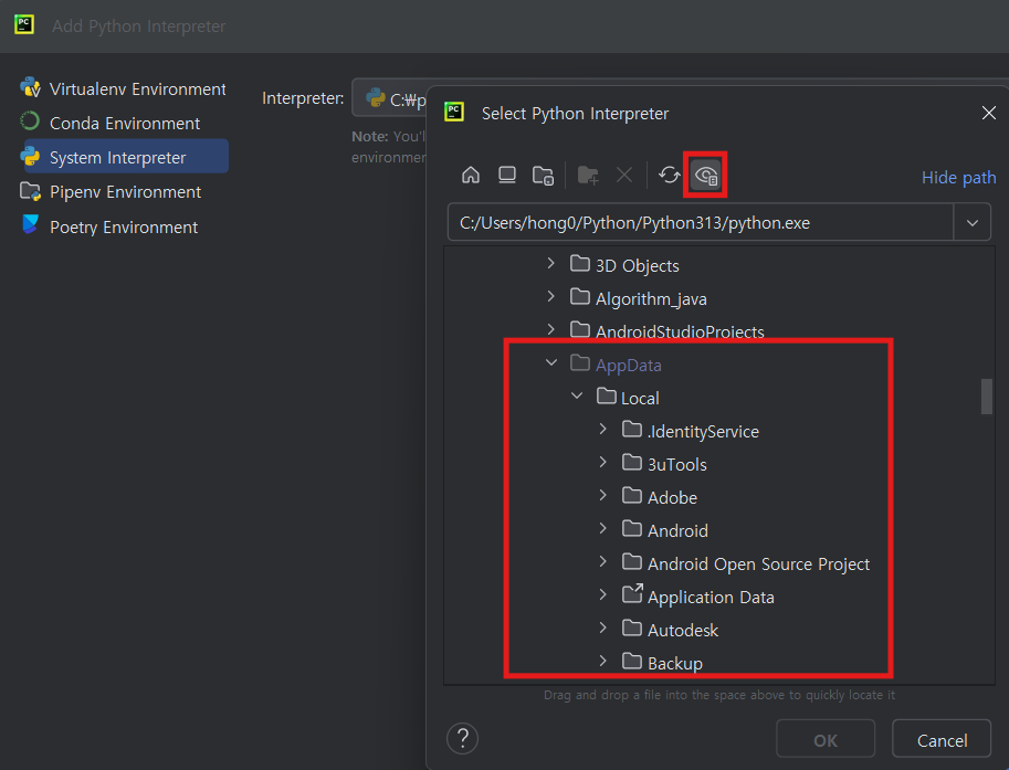 인터프리터 변경 중에 파이썬이 깔려있는 AppData 디렉토리가 나타나지 않아서 애를 먹었는데 오른쪽 위에 눈모양 아이콘을 클릭하면 숨김 파일까지 모두 확인할 수 있다!