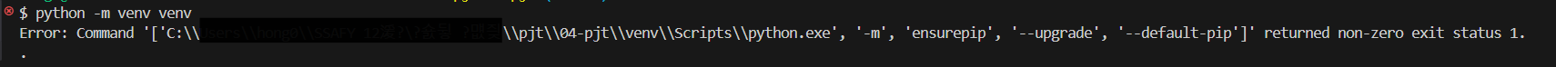 이 에러는 Python 가상환경을 만들 때 ensurepip 모듈을 통해 pip를 설치하려고 했지만, 실패한 경우 발생할 수 있습니다. 몇 가지 해결 방법을 시도해 볼 수 있습니다.