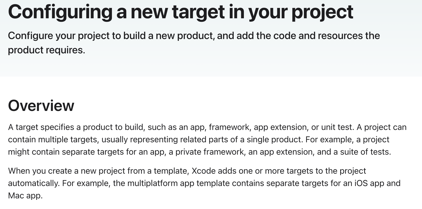 Xcode에서 project를 빌드할 때 하나이상의 target을 설정해서 빌드를 할 수 가 있다. 이 때 설정하는 target은 product단위 이다.