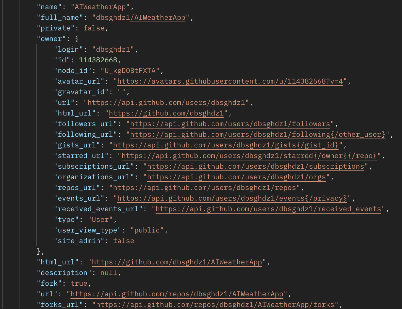 만들어진 레포를 보기 위해서 https://api.github.com/user/repos 이쪽으로 Get Method를 호출해보면 response를 받을 수 있을 것이다.