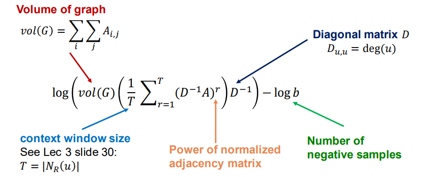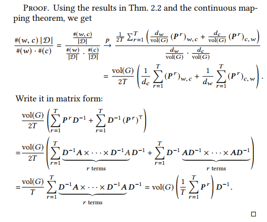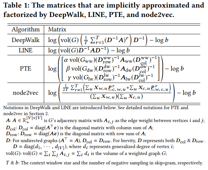 - Skip gram with negative sampling(SGNS)의 수식을 행 확률론적 행렬(Walk의 한걸음)의 거듭제곱으로 r개의 walk를 표현하여 유도