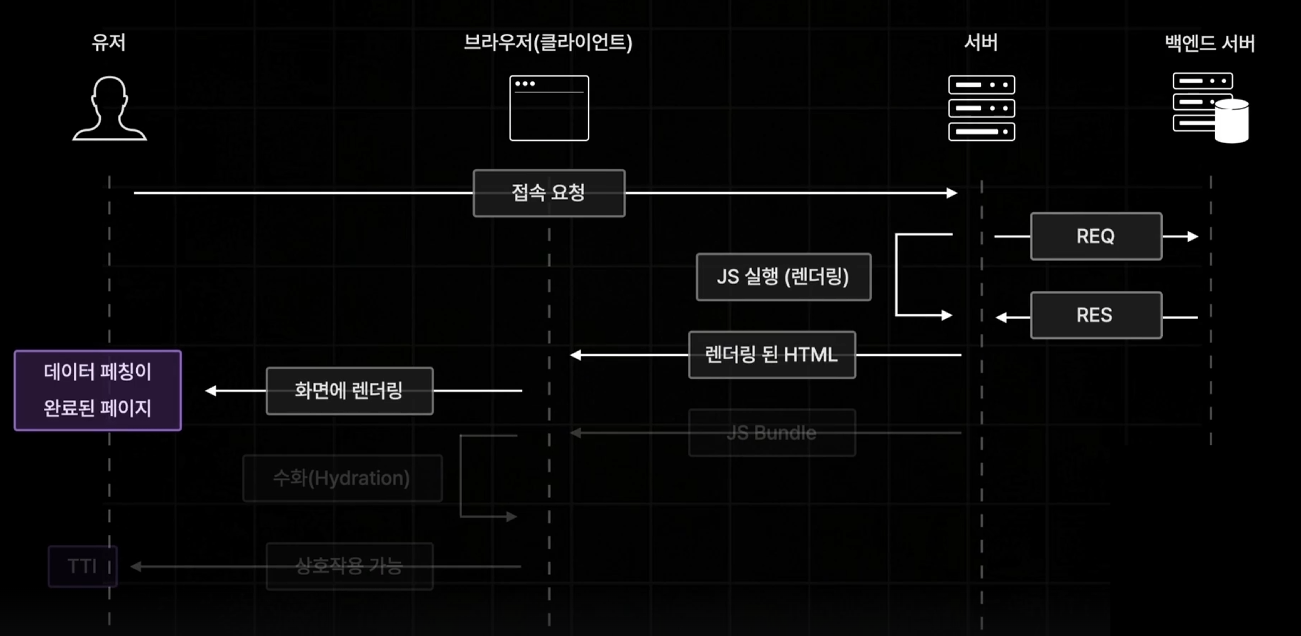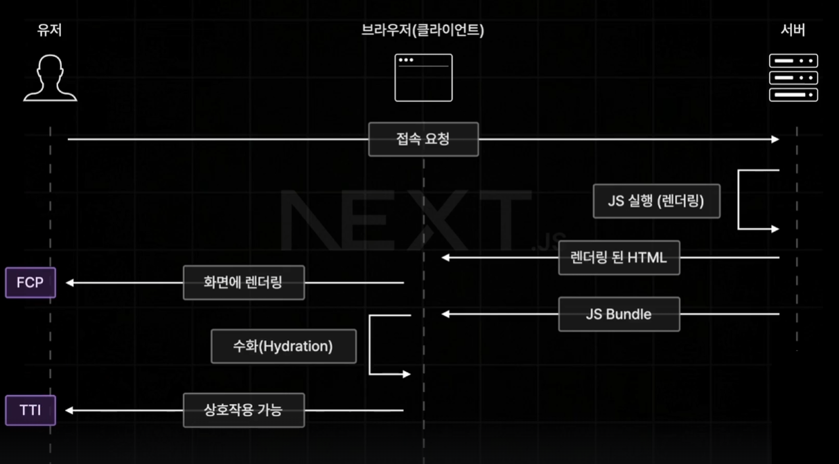 이후 서버에서 JS Bundle을 보내주고, 브라우저에서는 수화 작업만 이루어지며 최종적으로 상호작용이 가능한 웹 페이지가 만들어진다.