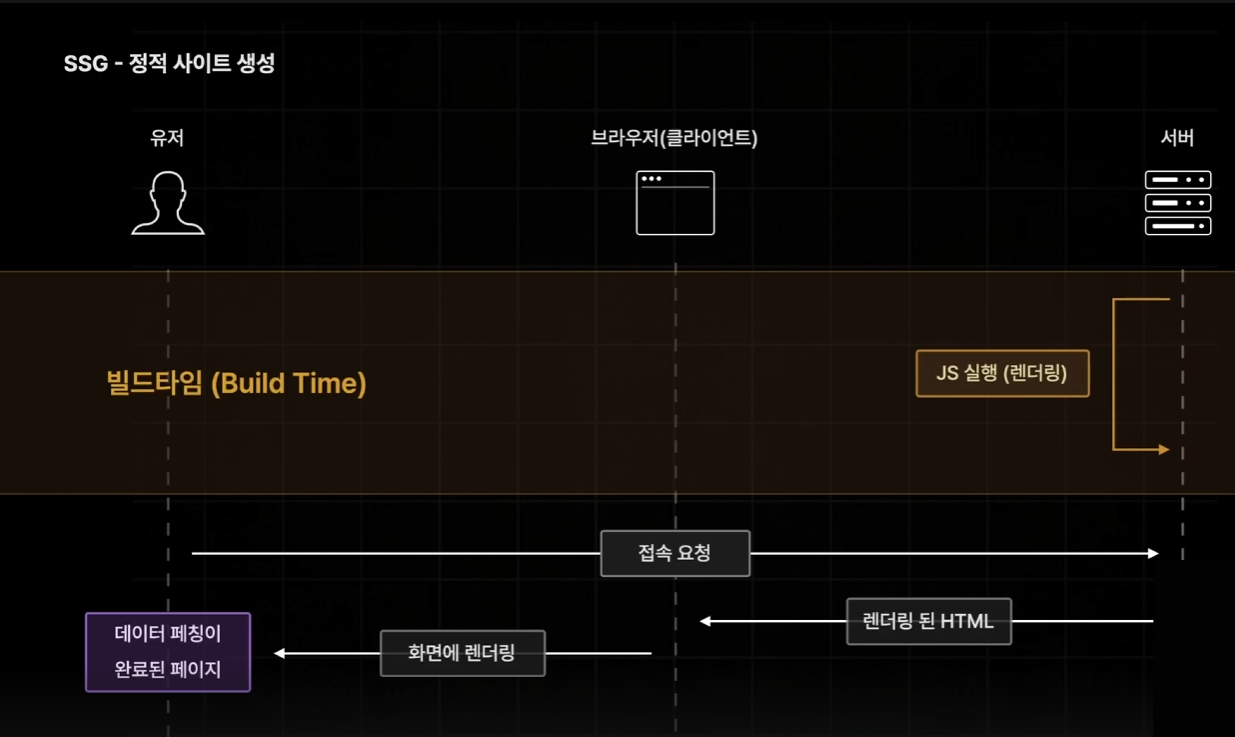 SSG는 이를 해결하기 위해, 빌드 타임에 데이터 패칭을 모두 완료함으로써 접속요청 발생시 바로 렌더링을 할 수 있도록 해준다.