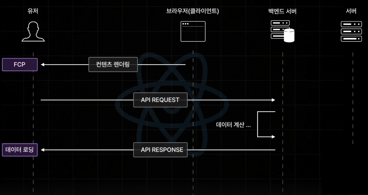 하지만, 이런 방식은 사용자입장에서 느린 FCP와 더불어 컴포넌트가 마운트 된 뒤,