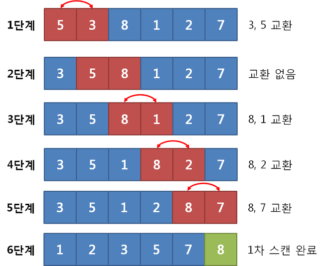 데이터가 무작위로 여러개가 있을 때, 서로 인접해 있는 요소 간의 대소 비교를 통해 정렬한다.