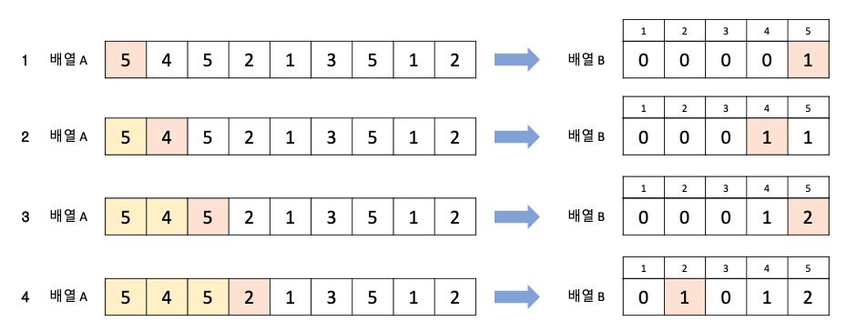 특정한 조건(데이터의 크기 범위가 제한되어 정수형태로 표현할수 있는경우)에서 매우 효율적이다. 이전의 정렬 알고리즘처럼 직접 데이터값들을 비교한 후, 위치를 변경하면서 정렬하는 것이 아니라 별도의 리스트를 선언하고 그 안에 데이터들의 정보를 저장하는 식으로 정렬한다.