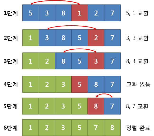 데이터가 무작위로 여러개가 있을 때, 이중에서 가장 작은 데이터를 선택해 맨앞에 있는 데이터와 바꾸고, 그다음 작은 데이터를 선택해 앞에서 두번째 데이터와 바꾸는 과정을 반복한다.