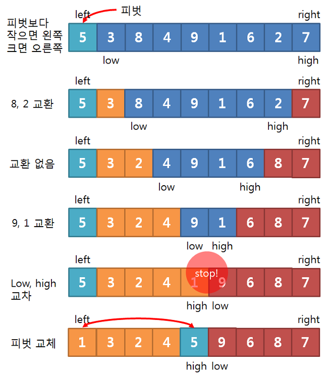데이터가 무작위로 여러개있을 때, 첫번째 데이터를 기준(피벗)으로 잡고 왼쪽에서부터 피벗보다 큰 데이터를 찾고 오른쪽에서부터 작은 데이터를 찾은 뒤 서로 교환해준다. 이렇게 계속 교환해주다가, 왼쪽에서부터 찾는 값과 오른쪽에서부터 찾는 값의 위치가 엊갈린다면 작은데이터와 피벗을 교체한다. 그 뒤, 피벗기준으로 나뉜 양쪽의 리스트들을 방금의 방식으로 개별 정렬시킨다.
