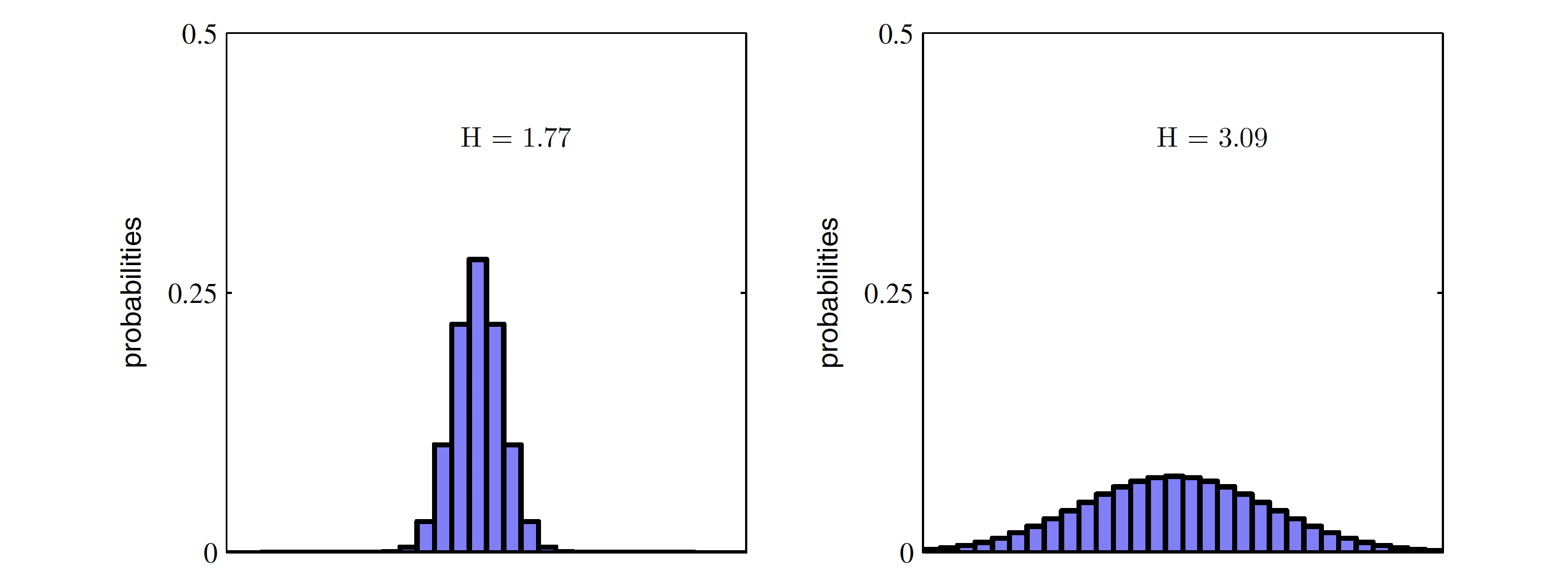 (다시, Entropy는 모든 사건이 같은 확률로 일어날 때(무작위성이 가장 높을 때) 그 최댓값을 갖는다. 왼쪽보다 오른쪽이 entropy가 더 높다.)