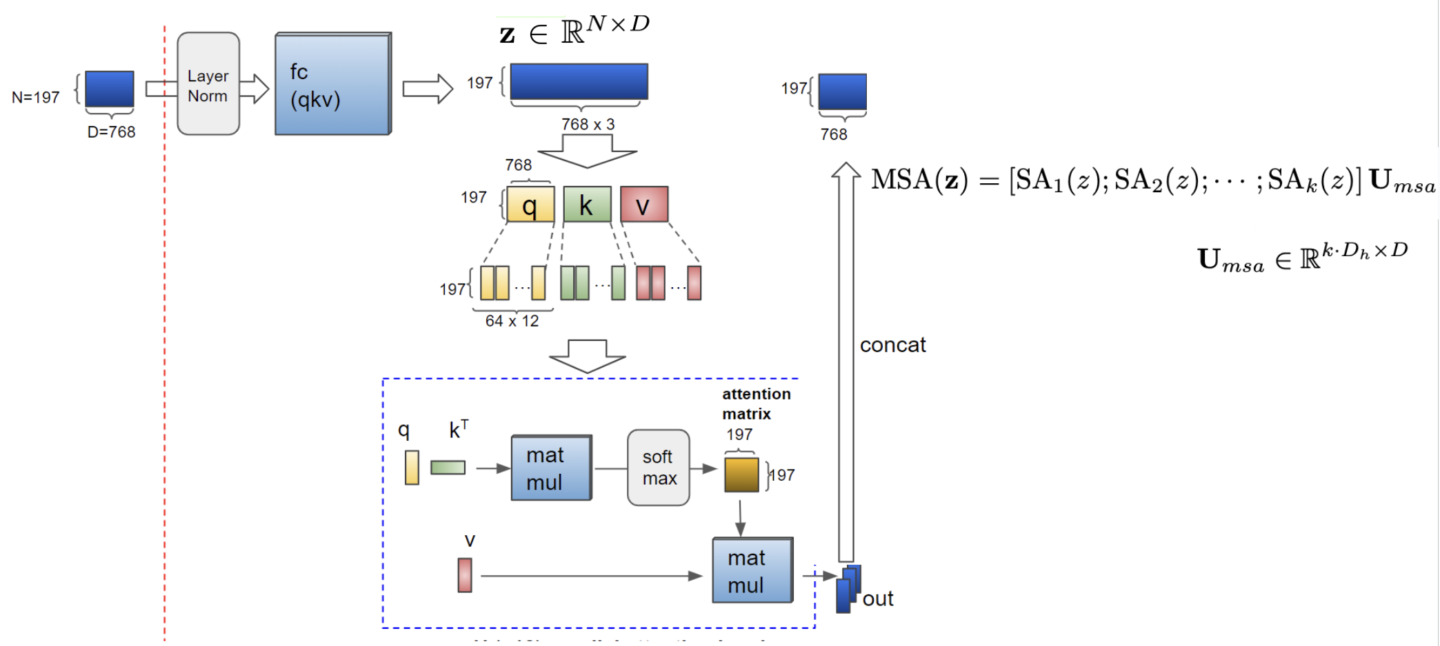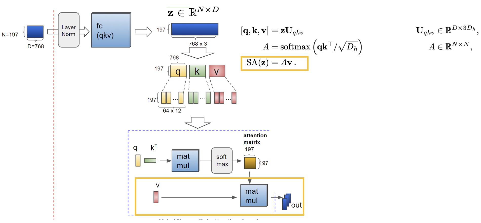 이런 식으로 되는데, 우리가 일단 위에서 patch embedding을 통해 얻은 z를 각 head의 q, k, v로 주고 내적한 후 scale과 softmax를 거쳐서 나온 attention score의 값을 다시 value에 곱하여 attention value을 구해준다.