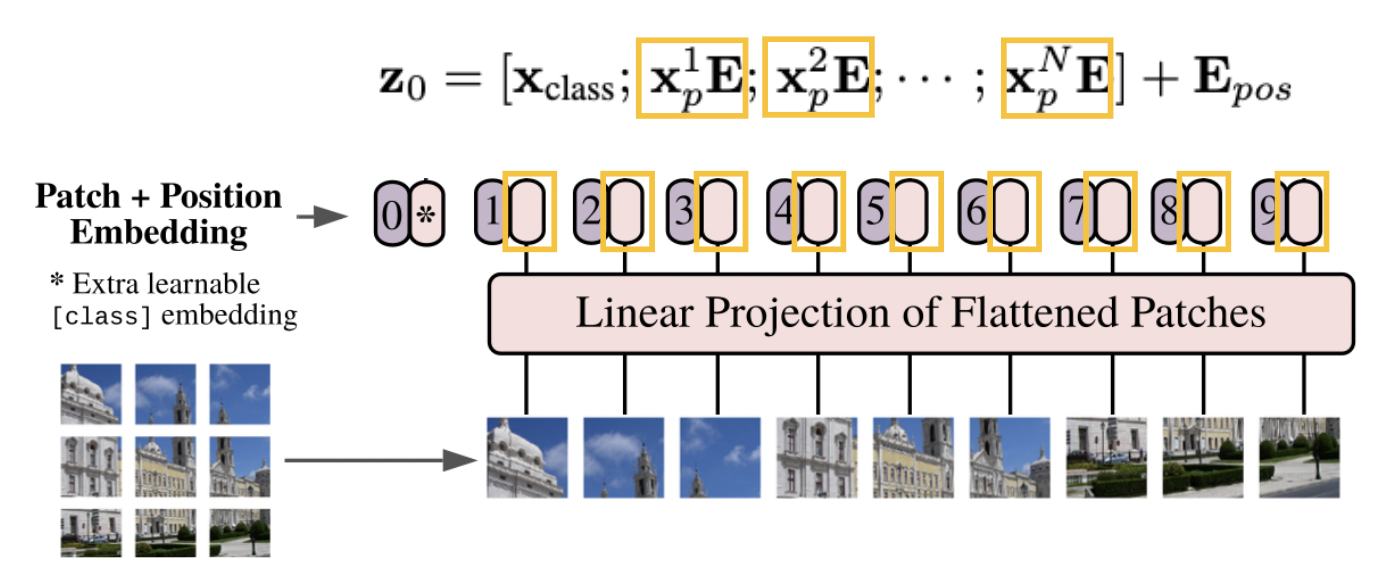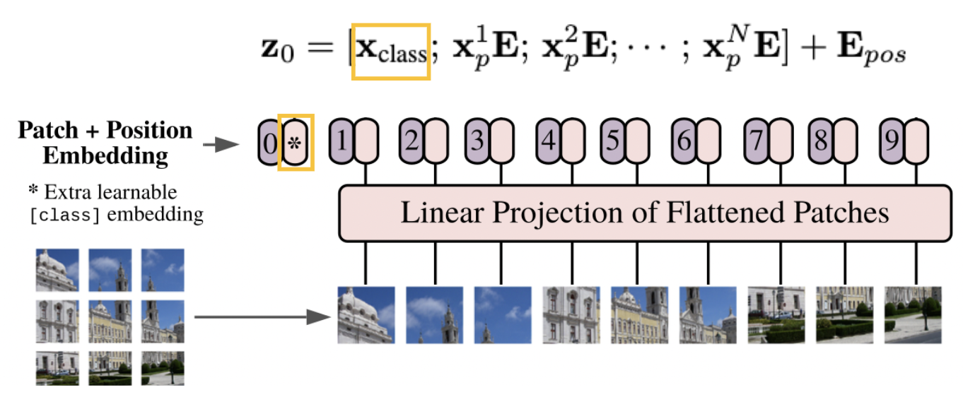 그리고 이것을 E라는 matrix를 곱하여 필자가 설정한 D크기의 constant latent vector로 linear projection해준다. => patch embeddings