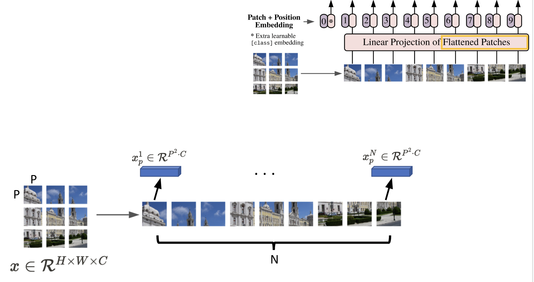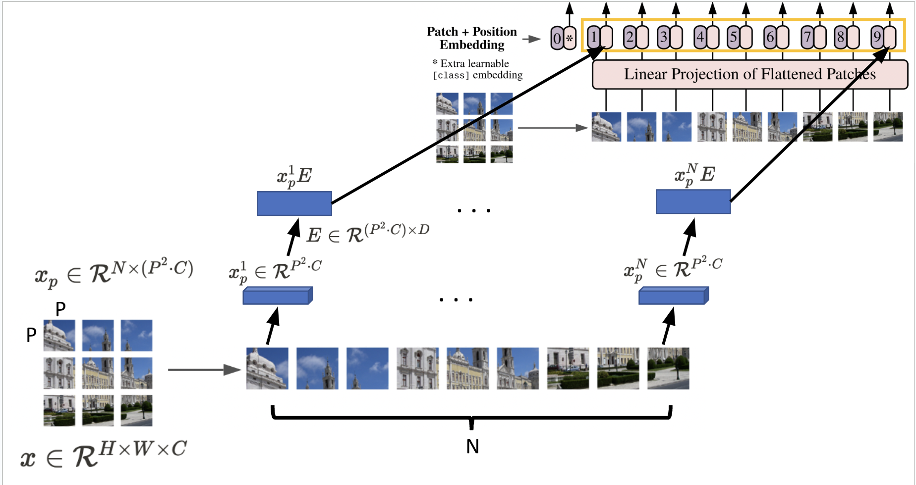 먼저 필자는 이미지()를 1차원 token의 sequence()로 flatten 시켜준다.