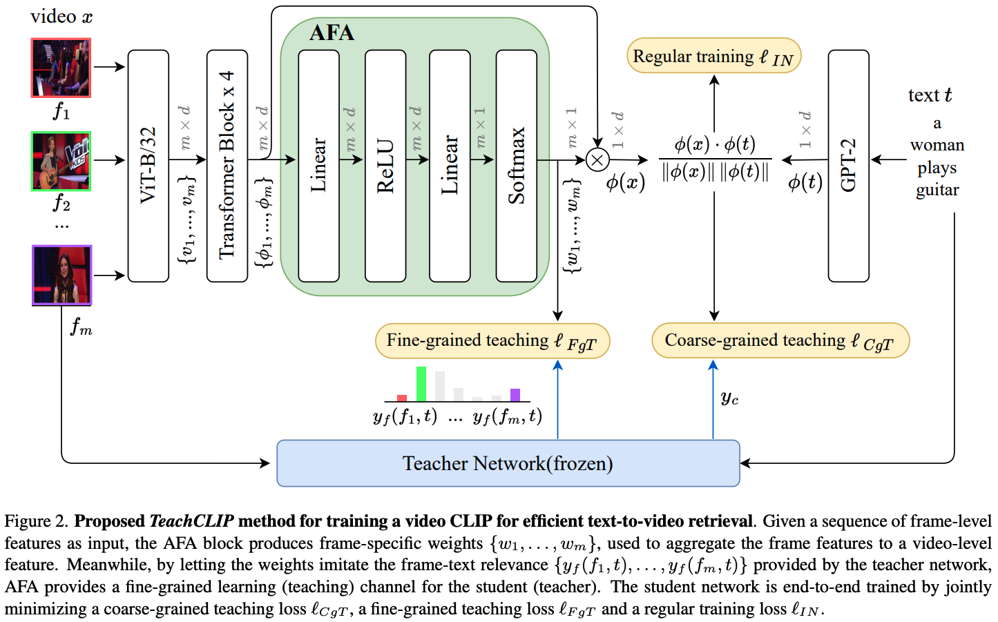 그래서 필자는 각 연관된 video-text pair 당 teaching loss 를 계산한다.(AFA 블록이 만든 프레임별 가중치들과 teacher이 제공했던 frame-text 유사도사이의 cross entropy loss를 계산한다.)