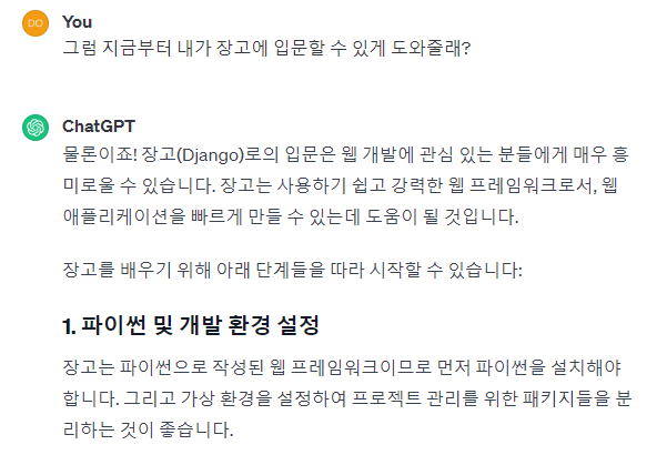이번에는 따로 책을 사거나 구글에서 맨땅에 헤딩을 하지 않고, Chat GPT3.5에게 장고를 배워보고자 한다. 즉 과외 선생님으로 채용한 셈이다.