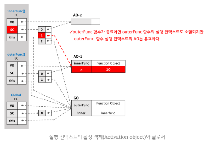 // outerFunc는 실행이 끝났지만, 내부 함수인 innerFunc가 x를 참조하고 있어