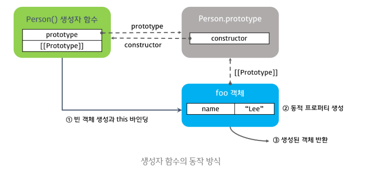 일반함수와 생성자 함수에 특별한 차이는 없으며 함수에 new 연산자를 붙여서 호출하면 해당 함수는 생성자 함수로 동작한다