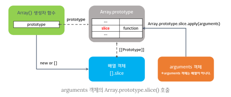 Array.prototype.slice() 메소드를 arguments 객체 자신의 메소드인 것처럼 arguments.slice() 와 같은 형태로 호출한 것이다