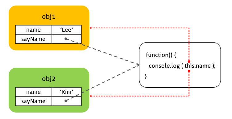 함수가 객체의 프로퍼티 값이면 메소드로서 호출되는데, 이때 메소드 내부의 this 는 해당 메소드를 소유한 객체, 즉 해당 메소드를 호출한 객체에 바인딩된다
