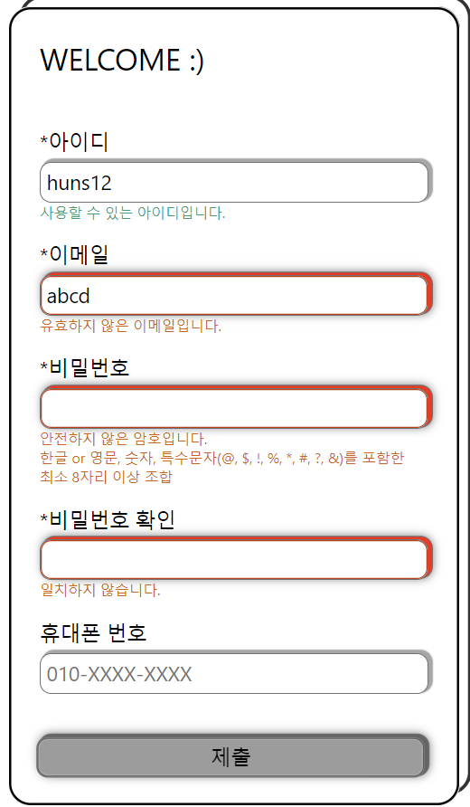 유효성 검사 실행 후 통과 여부에 따른 메시지를 실시간으로 띄어 에러 정보성을 높였다. 또한 submit button 클릭 시 입력되지 않았거나 잘못된 입력을 한 input box에 적색으로 표시해주어 최종적으로 한꺼번에 오입력을 확인할 수 있게 하였다.
