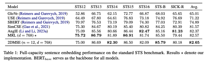 (훈련을 할 때도 Back Prop을 위해서 Forward Pass를 해야하는데 결국 차원의 종류 개수가 6개라면 한번의 훈련에 6번 Forward Pass가 필요). BERT-base를 Ang1E Loss를 사용해서 훈련시켰을 때, intermediate layer에서 성능 하락을 목도하였는데, 모든 Layer에서 좋은 성능을 달성하고자 하는게 2D MSE의 목적이다. 즉, 2D MSE는 Embedding Size 뿐만 아니라 Transformer Layer에 대해서도 MSE가 제대로 훈련될 수 있도록 하는 연구이다.