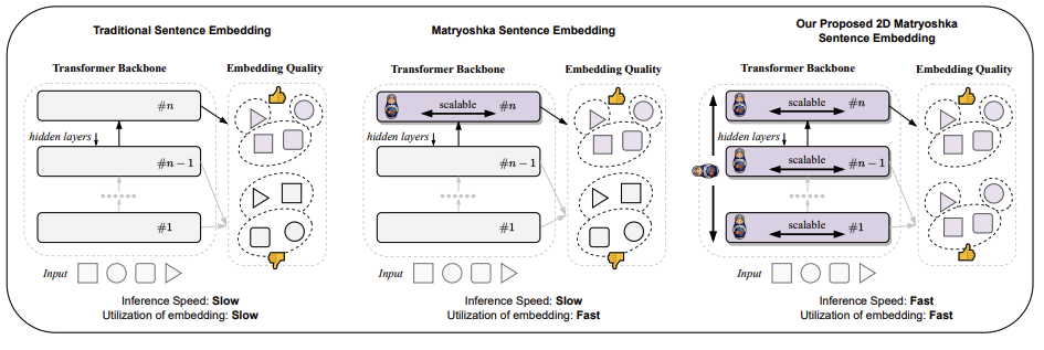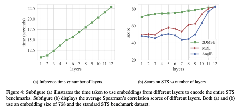 MSE를 통해 (약간 낮지만) 유사한 성능을 가질 수 있는 문장 임베딩을 얻을 수 있게 되었으며, 14배 더 줄어든 임베딩을 통해서도 Downstream Task에서 속도와 성능을 모두 향상 시킬 수 있는 임베딩을 만들 수 있게 되었다. 하지만 MSE는 모든 Sentence Transformer Embedding과 같게 ‘Last Transformer Layer’를 사용하는데 이는 Efficiency의 다양한 면에서 일부를 놓치고 있는 것이며 이는 Inference Speed이다.