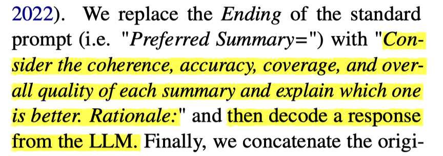 prefered summary 쪽에 1, 또는 2가 쓰여질 텐데, token 1 (선호), token 2 (비선호) 에 대한 log 확률값을 얻어서 softmax를 취해 선호와 비선호에 대한 비율을 측정한다.