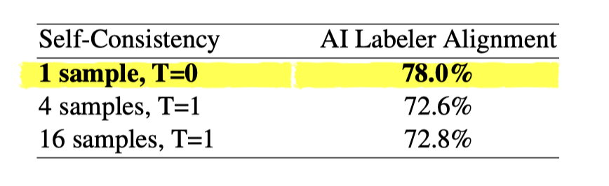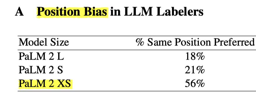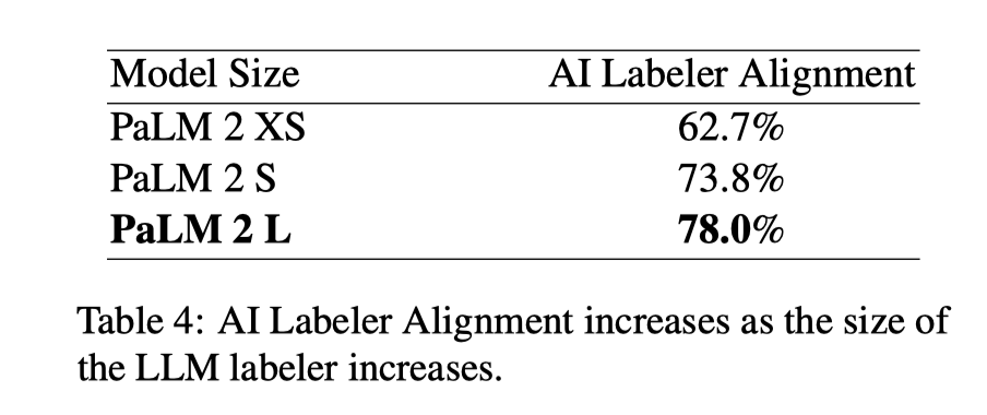 - 모델 크기가 크면 클수록 alignment가 좋아지는 것을 확인했고 최종적으로는 PaLM 2L을 AI labeler로 선정하였다.