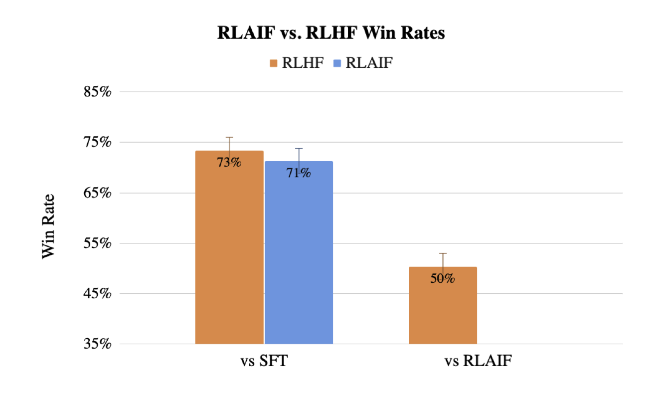 - AI feedback과 Human feedback 사이의 직접적 비교 연구를 수행하였고 AI feedback 만으로도 human feedback 에 근접한 성과를 낼 수 있음을 보였다.