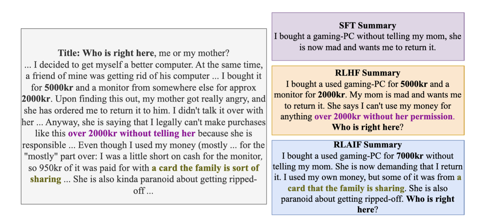 - RLAIF가 다소 응집성이 떨어지고 문법이 틀리는 경향이 있다.