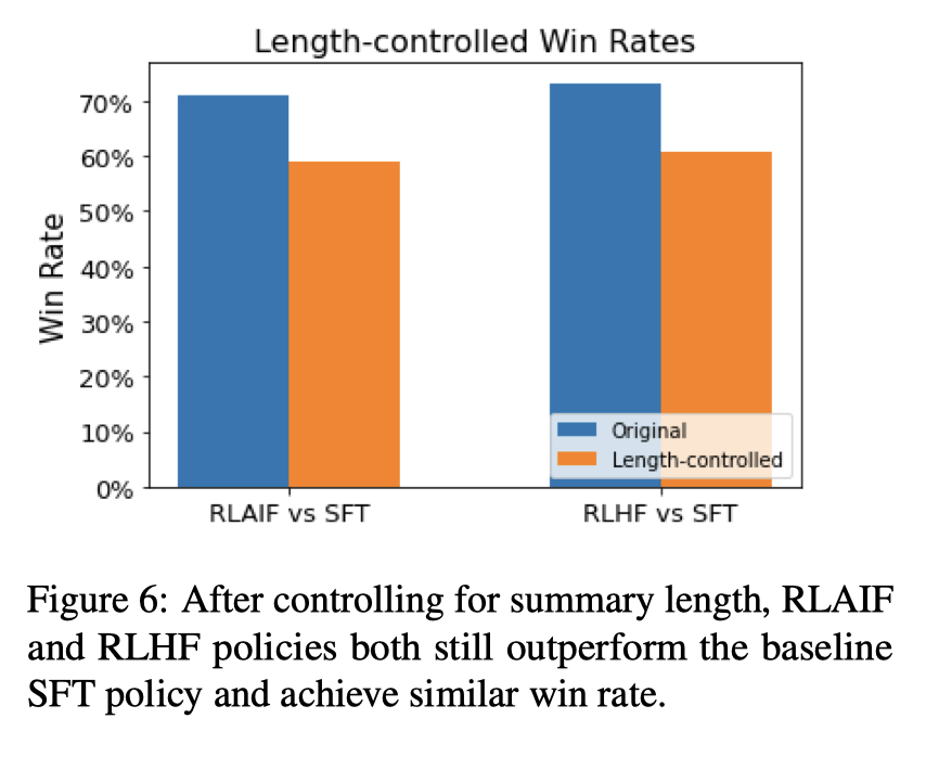 - 만약 생성 길이를 제약(controlled)하면 SFT 대비한 승률이 다소 낮아진다. (70% ⇒ 60%) . 하지만 여전히 RLHF와 RLAIF는 comparable하다.