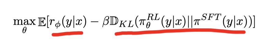 - 정책 변화시에 원래 SFT로 너무 급격히 변화하지 못하도록 양 분포간의 차이(KL divergence)를 penalty term으로 추가한다. (다른 말로는 reward hacking 방지)