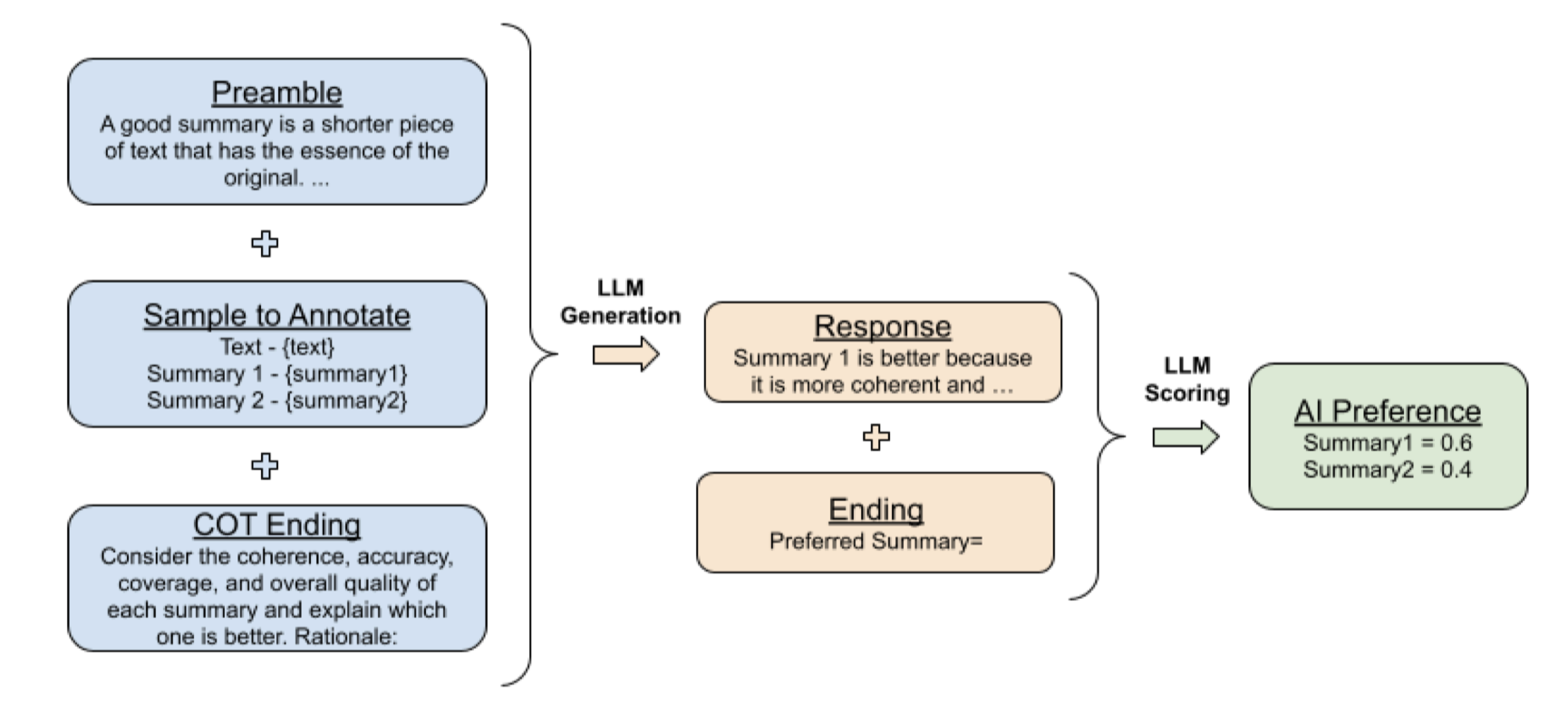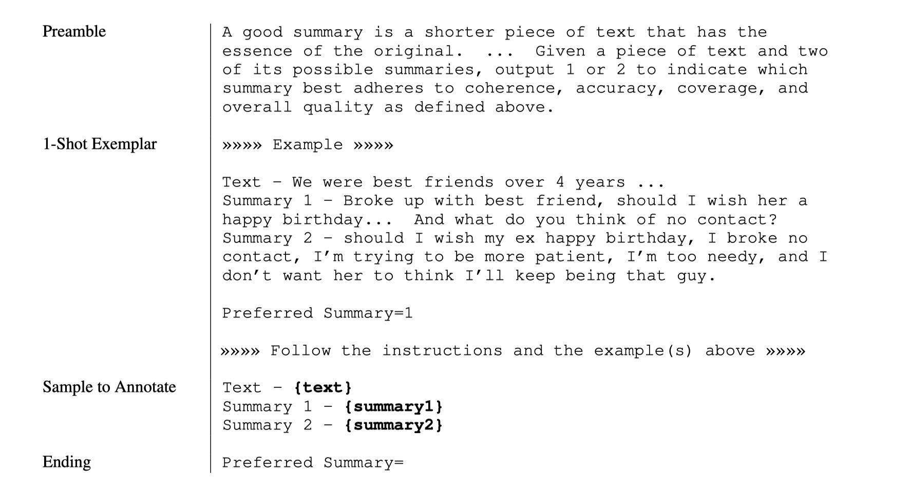 요약(summarization) task에 대해서 하나의 긴 입력 문장에 대해서 두 개의 서로 다른 요약문이 있을 때 LLM labeler로의 prompt은 다음과 같이 구성된다.