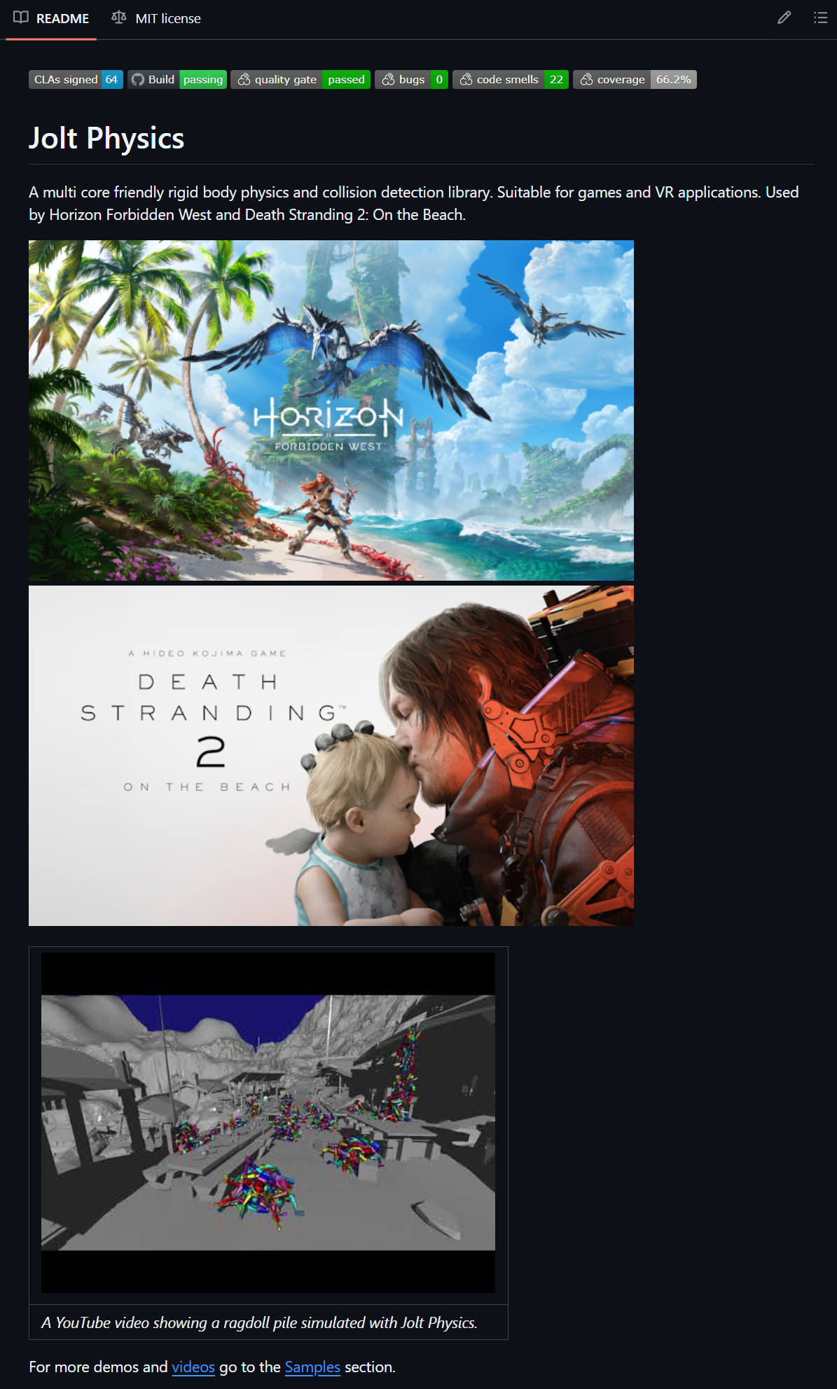 가장 첨단이자 상용 게임(최근 출시된 데스 스트랜딩2)에도 쓰이는 Jolt Physics를 쓸 거다.